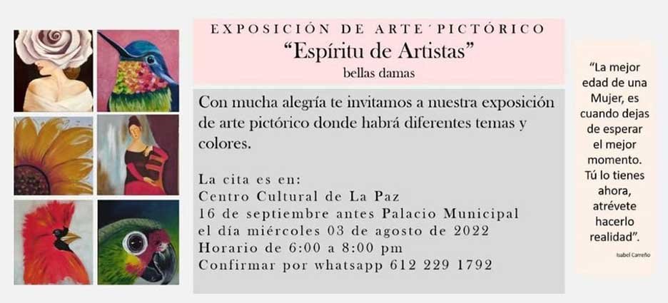 La Paz, Baja California Sur.- Diferentes temas y colores, es que tiene para cada uno de los asistentes la exposición pictórica donde habrá “Espíritu de Artistas”, bellas damas de Isabel Carreño.